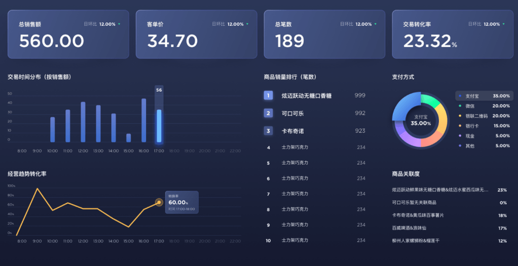 此系統透過數據,統整出總銷售額、客單價、總比數和交易轉換率等關鍵指標,還提供了交易時間分布圖,顯示個時間段的銷售情況,並列出商品銷量排行榜,幫助商家了解熱銷產品。此外,系統也提供不同支付方式的使用比例分布圖,有助於商家針對性地優化支付選項和服務,進一步提升顧客滿意度和銷售效率。