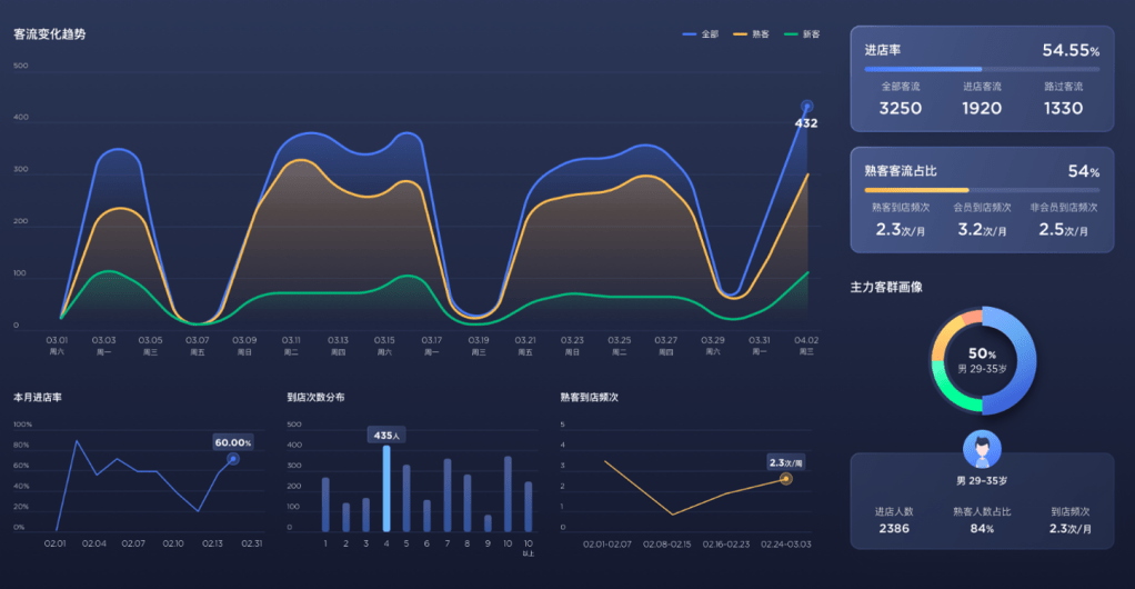 此系統使用精細的數據分析,透過圖表詳細呈現客流變化趨勢,例如每日的全體客流、熟客及新客數據等等,並更進一步分析本月進店綠、到店次數分布、到店次數分析和熟客訪次數之變化,幫助商家了解客流動態。此系統不僅能優化營運策略和提升客戶服務,還能顯著提升整體商業表現。