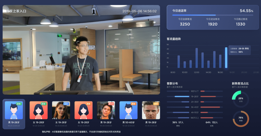 此系統利用 AI 攝像機實時捕捉店內外人流動態,並進行客流量、客群分布等分析,有效幫助商家了解客流動態,進行精準營銷和服務改進,提升顧客體驗和店鋪運營效率。