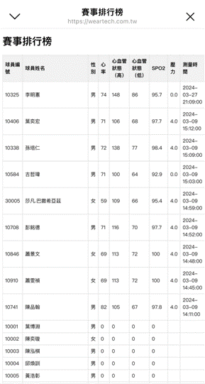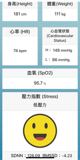 使用選手號碼來檢測(攝影 5~7 秒,請在光線充足下),上傳影片至雲端約 20~22 秒,即可完成生理指數檢測(心率、血壓、血氧、壓力指數 )。
