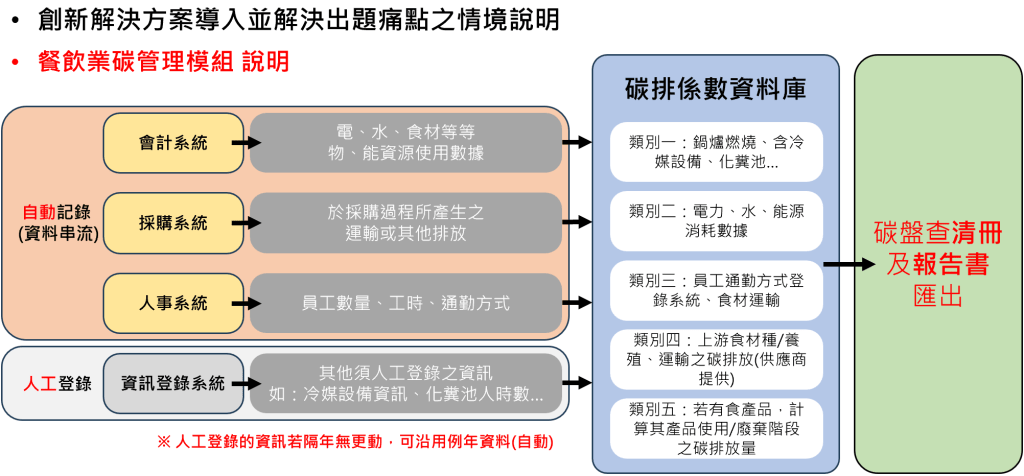 碳排放量管理系統應用於餐飲業能有效地幫助餐飲業者追蹤、管理並減少其運營過程中的碳足跡。此系統整合了自動和人工登錄的各類數據,例如能源消耗(電、水、燃料)、員工通勤方式及供應鏈的碳排放資料。通過將這些數據歸入碳排係數資料庫,系統能生成詳細的碳排放清冊和報告,幫助餐飲業者在符合環保規範的同時,制定有效的減碳策略。